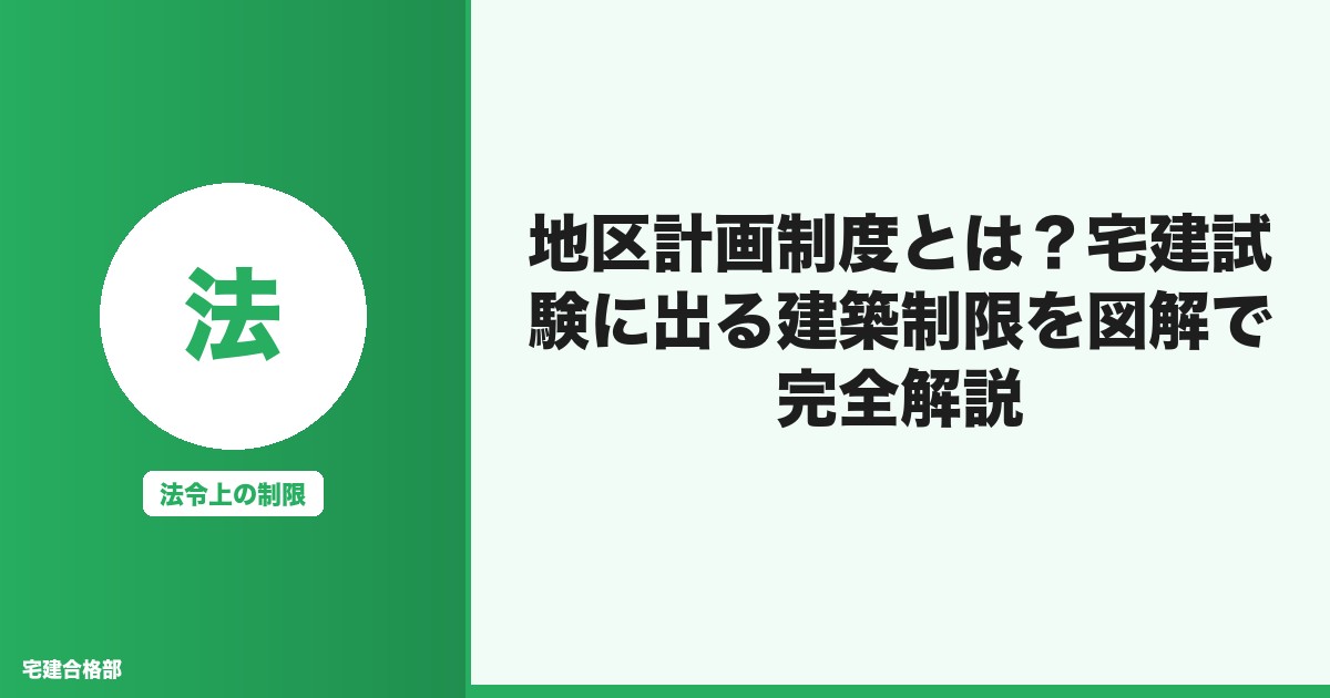 地区計画制度を宅建試験対策用に完全解説!建築制限・容積率・建蔽率の上乗せ規制、提案制度の要件(0.5ha以上・2/3同意)まで図表とジョークで分かりやすく説明。都市計画法の頻出ポイントを抑えて合格を目指そう!